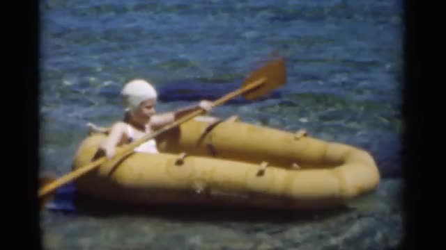 > 1949: girl floats inside yellow inflatable boat using double-paddled oar NEW ORLEANS LOUSIANA