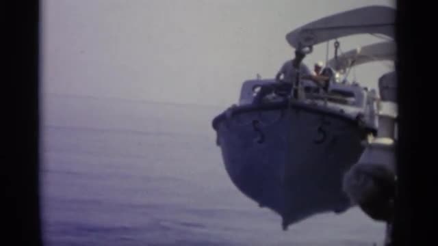 > 1965: people watch as a life boat is slowly lowered into the ocean on an overcast day SICILY