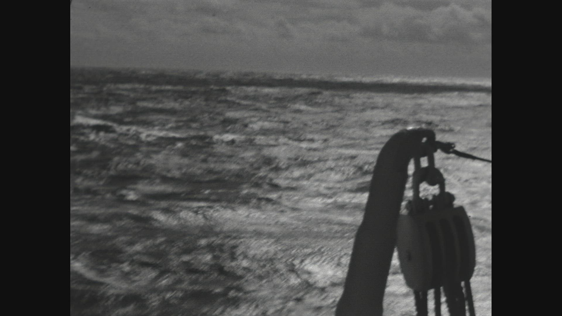 > 1967: ocean and rocks with ship in the distance, camera panning left to right US VIRGIN ISLANDS