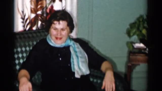 1955: a cute old lady sitting in the couch and chatting cheerfully NEW YORK CITY