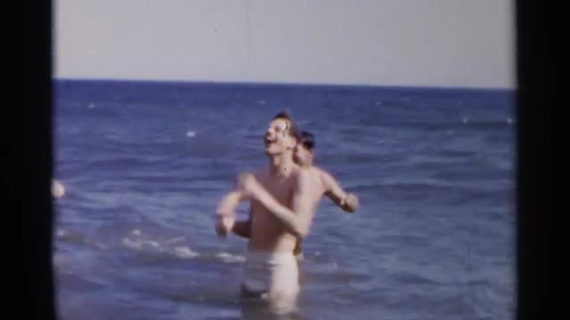 > 1954: a trio of male friends play in the surf and splash one another. NEW YORK