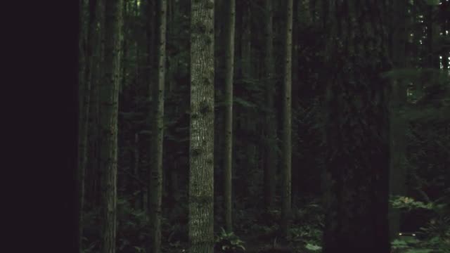 Dolly movement through dark forest in Washington