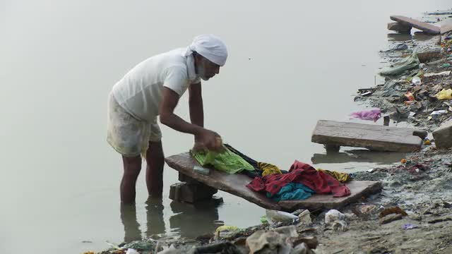 1965: a man pulling a water machine and spread out the water at the steps for cleaning the place. MI