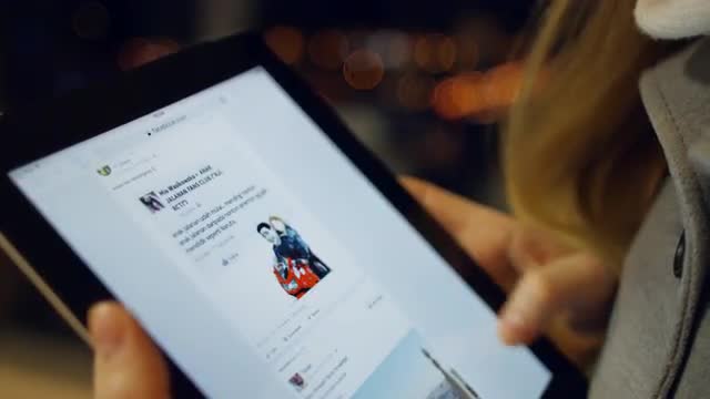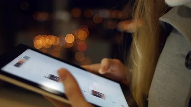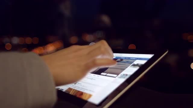560970 - The man on tablet computer dials the message text search query.