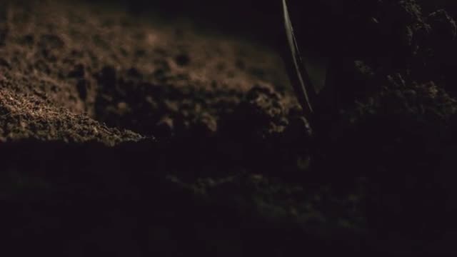 Close up of a pick axe digging into the dirt