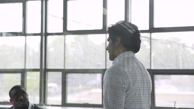 801823 - Business people talking near whiteboard in meeting