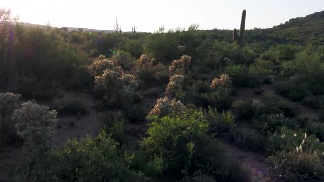 946698 - Slow pan across desert landscape at sunrise, low wide 4k