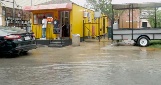 > 1965: the man watch the street it affecting by flood surrounded with full of water causes of rain MI