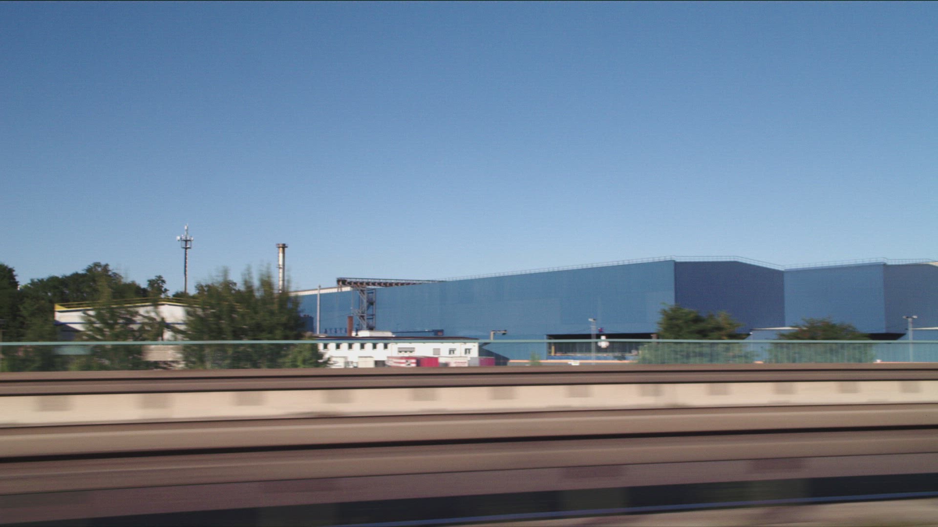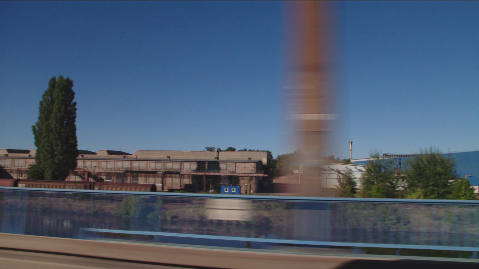 > 1964: waterside industrial city area with side forest with trees on a shiny day blue sky MINNESOTA