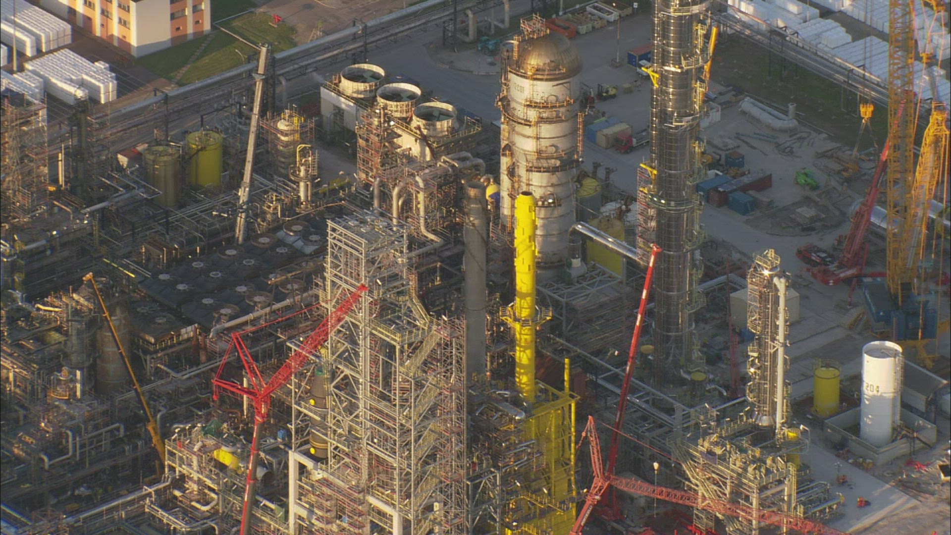 > 1960: industrial area near water with cranes and white sand stack, industrial equipment with chimney