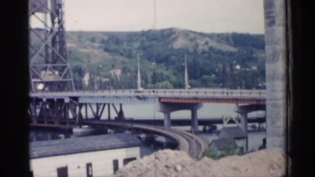 1960: part of bridge across a water body, road bridge above, rail below MICHIGAN