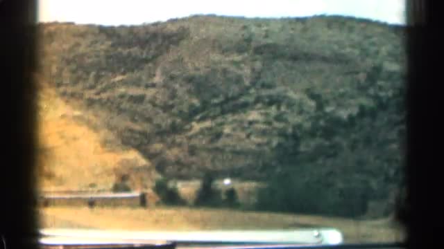 > 1963: the rocky cliffs of mountains whiz by as a vehicle drives past COLORADO