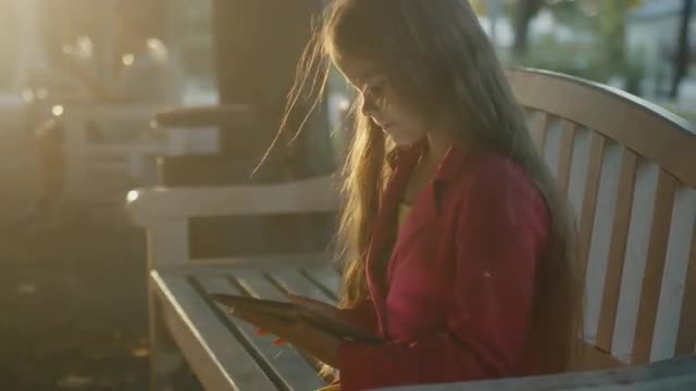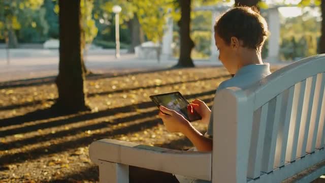 > Young girl on a Tablet PC application chooses for himself and is going to download. 4K 30fps ProRes