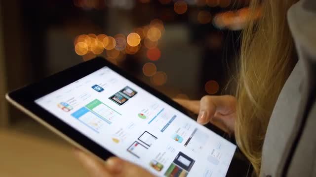> Young girl on a Tablet PC application chooses for himself and is going to download. 4K 30fps ProRes