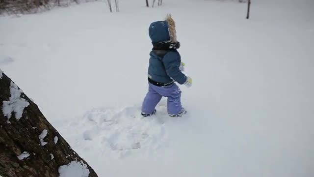 > Little boy running through the snow slow motion