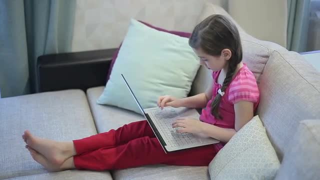 > A girl on the sofa is education on a laptop
