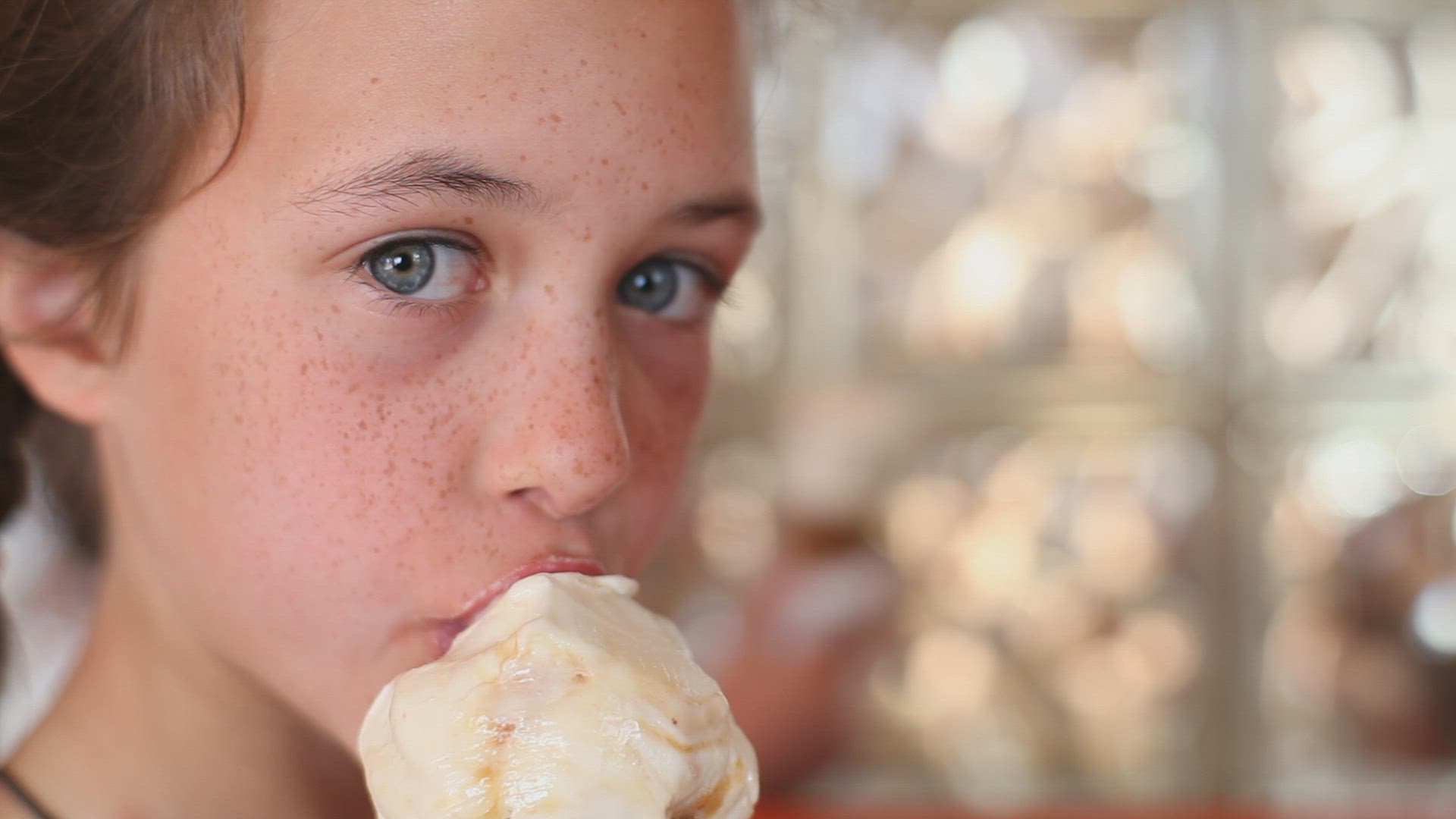 Girl eating ice cream in the kitchen.
