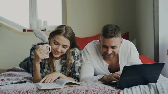 > Girl lying on the bed moves feet