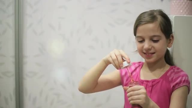 > Little girl blows soap bubbles