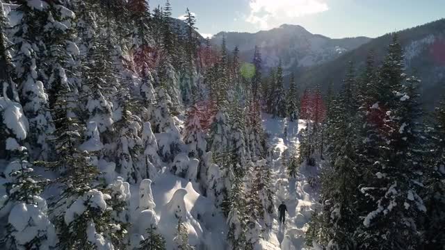 > Aerial of Frozen Winter Landscape in Mountain Forest Valley with Snow Flakes Falling on Ice Cold Riv