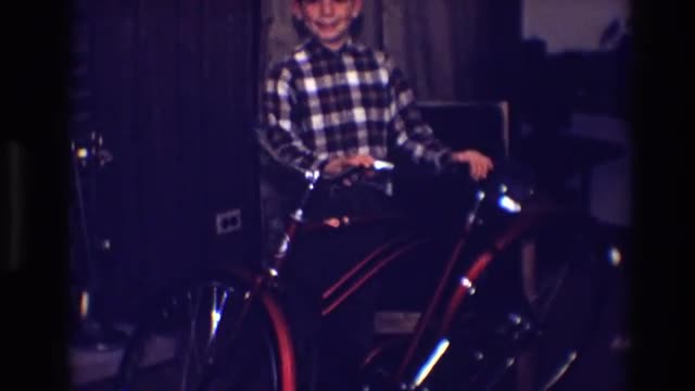 > 1963: boy riding his red bicycle around the street towards his house to meet his baby sibling MISSIS