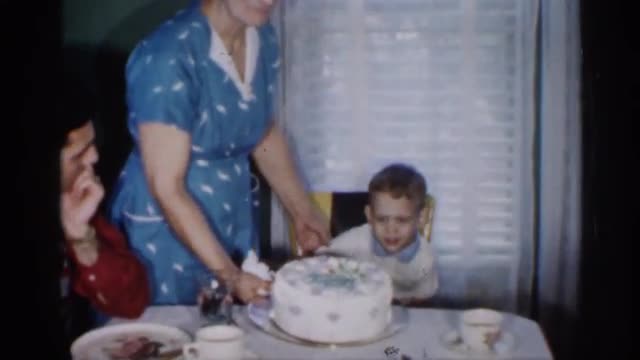 > 1958: grandmother seating birthday boy in front of his cake while family celebrates NEW JERSEY