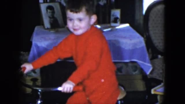 1958: panning footage of a child playing in a living room. FLORIDA