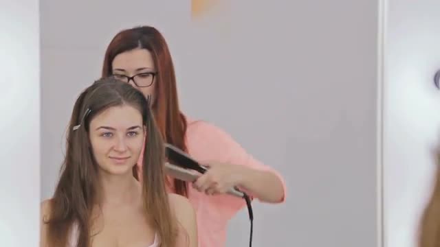 > 2 shots. Professional hairdresser doing hairstyle for young pretty woman with long hair
