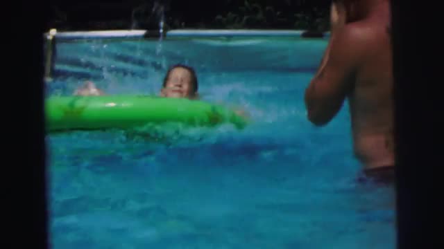 > 1959: people swim and play with floaters in a pool on a fun warm day. INDIANA