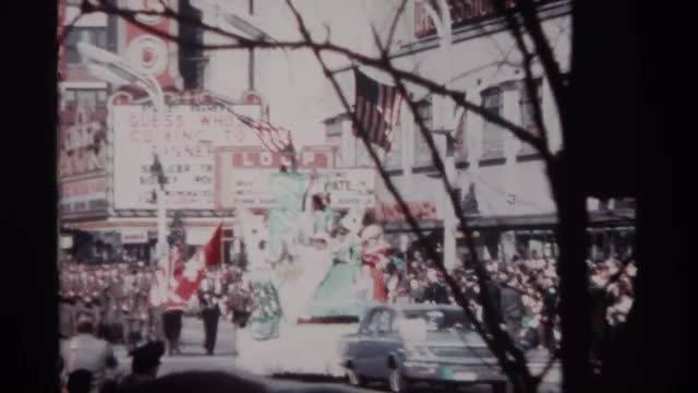 > 1959: a group of peoples are parading in a city place with tall buildings and shops with sign NEW YO