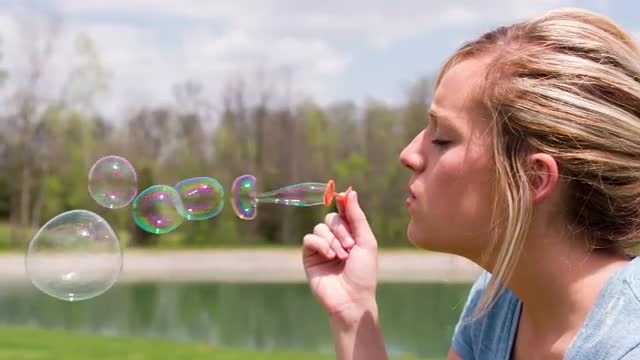 Pretty, young woman with beautiful make-up and elegant hairstyle blowing bubbles