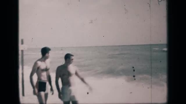 > 1959: two adult men at the beach with sizable waves and a boy runs past them both CALIFORNIA