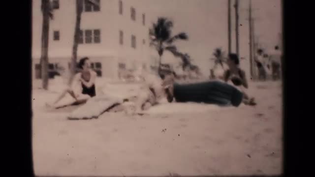 > 1959: the women and man take the sun both in beach near to sand back side tree and building and sky