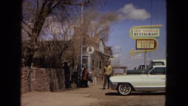 650216 - 1967: man walking in front of old restaurant and car. women entering phone booth. ARIZONA