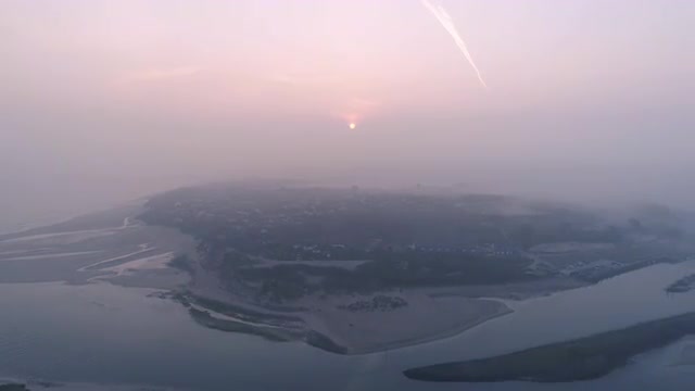 1001314 - Aerial misty moody sunrise over dunes, cliffs, river and sea at Hayle, Cornwall, UK