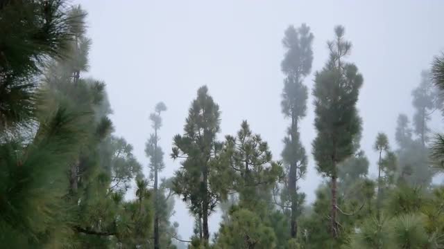 A view of the pine forest canopy of the La Esperanza forest on Tenerife. Low level clouds pass through the trees.