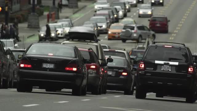 > Medium close up of traffic in downtown Vancouver, B.C.