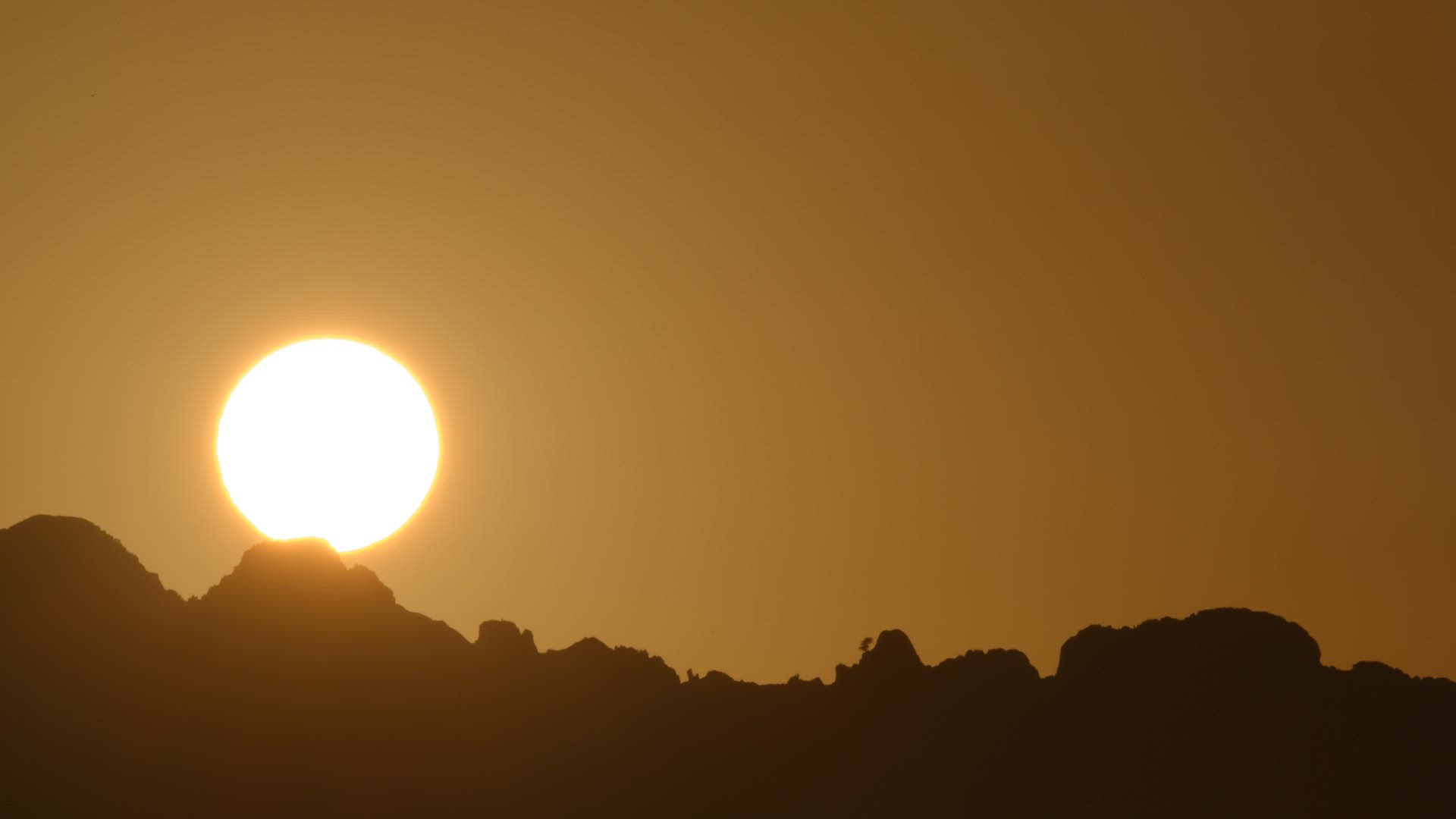 > Wide shot of large sun setting behind the sand dunes