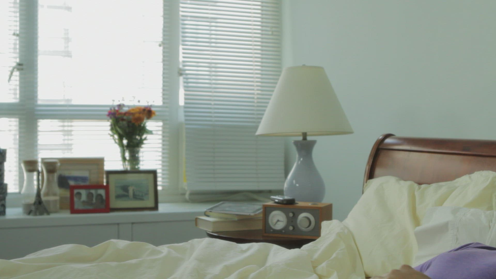 > Quiet Morning With Gentle Loving Couple in Bedroom Next to Bed Light on Background of Table Decorati