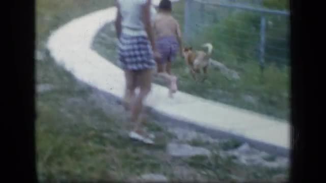> 1959: some of the people play with dog and baby she carry the child and another one carry the dog FL