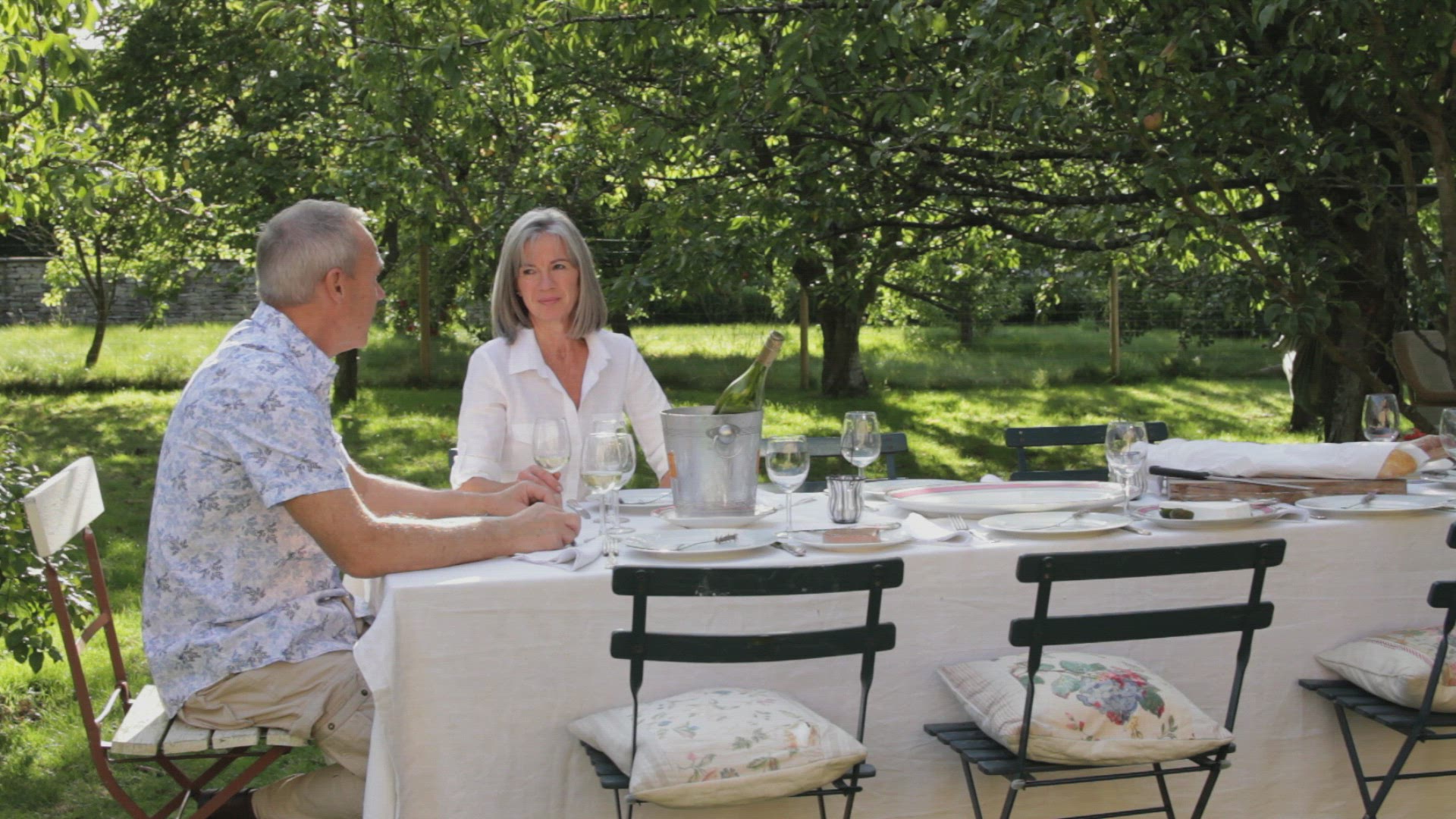 > 1969: the men and women sit in the garden center place chair and table morning time near building co