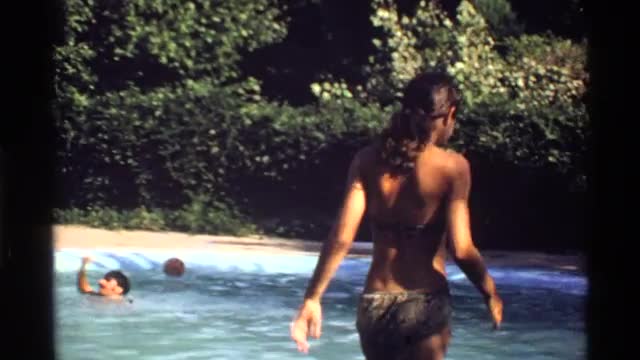 > 1978: a girl throwing a ball to the boy who is in swimming pool CALIFORNIA