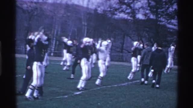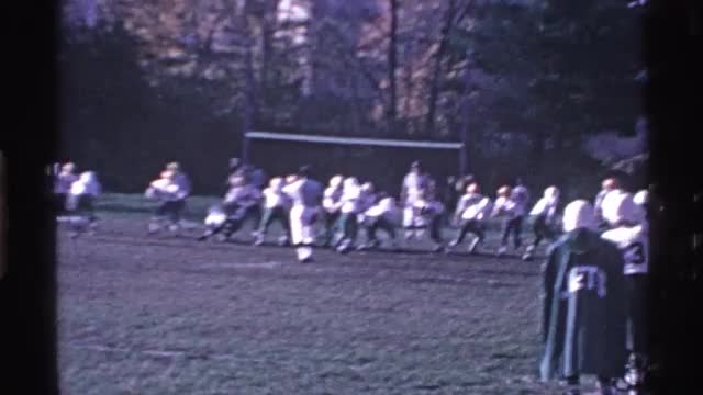 > 1969: the football match ground player very fast run take the ball edge line view of the people sit