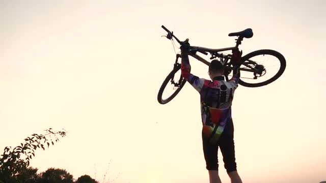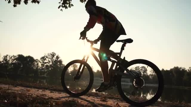 Child riding a bike with training wheels with lens flare slow motion at sunset.