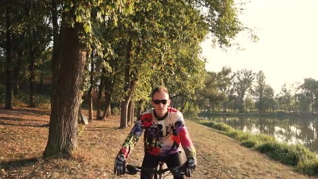 Child riding a bike with training wheels with lens flare slow motion