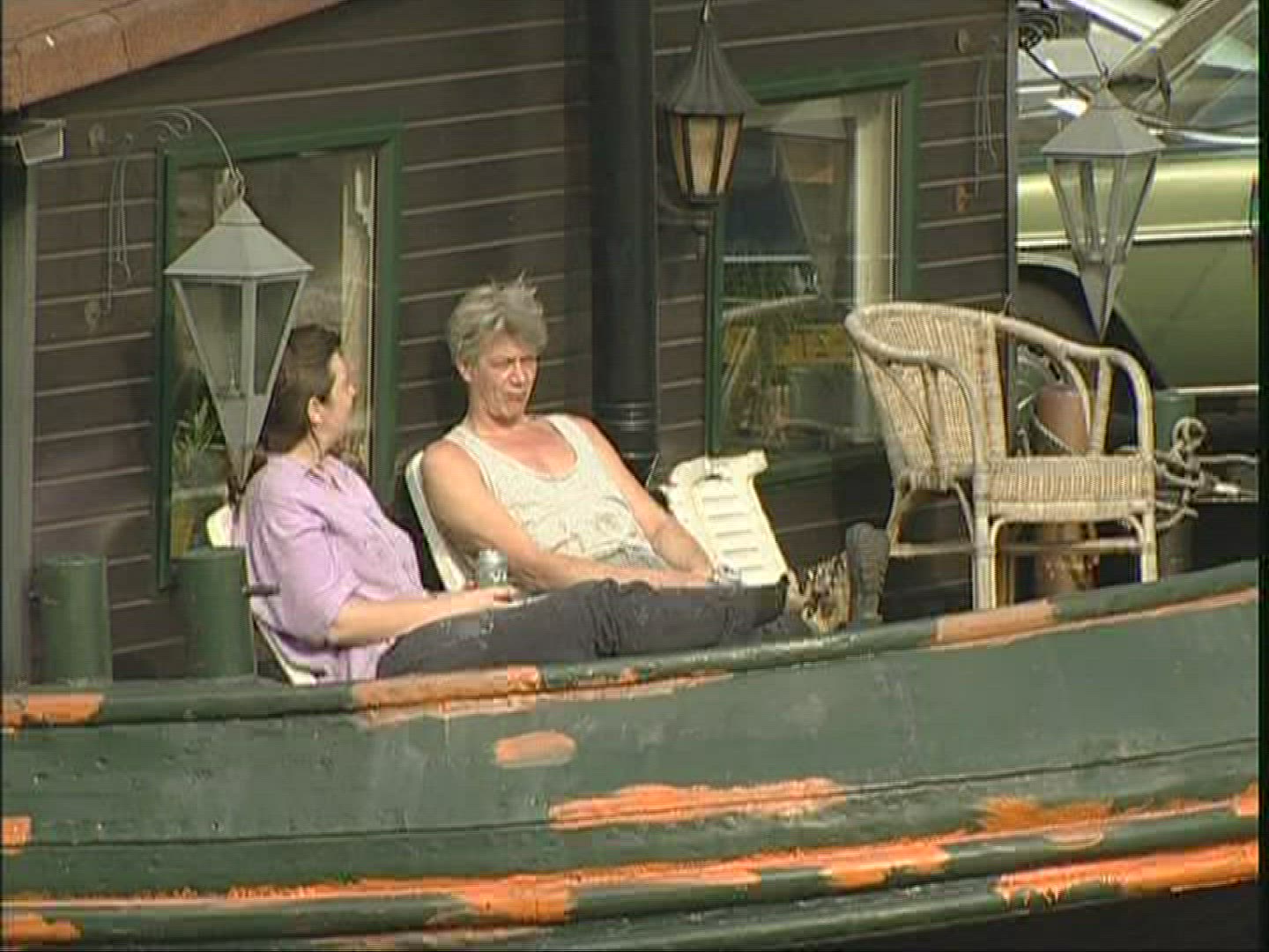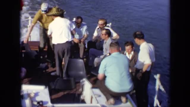 1969: elderly people sitting in lawn chairs near the docks where boats are parked. OHIO