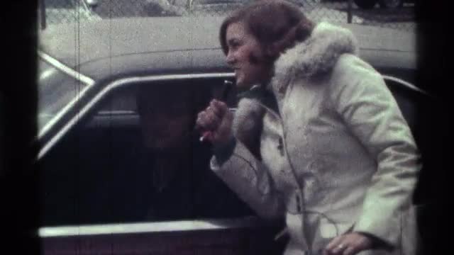 1976: a smiling lady walks up to and hugs a man standing near a car KENTUCKY