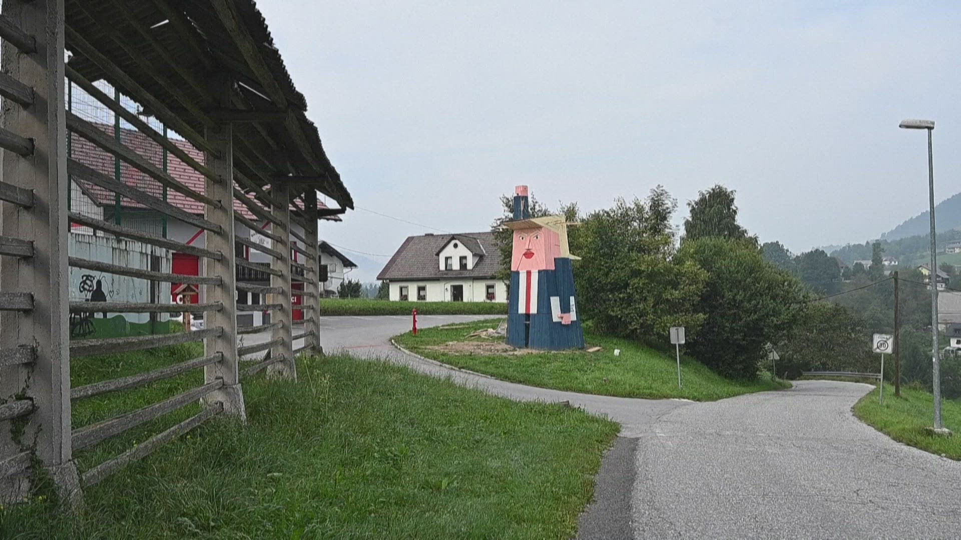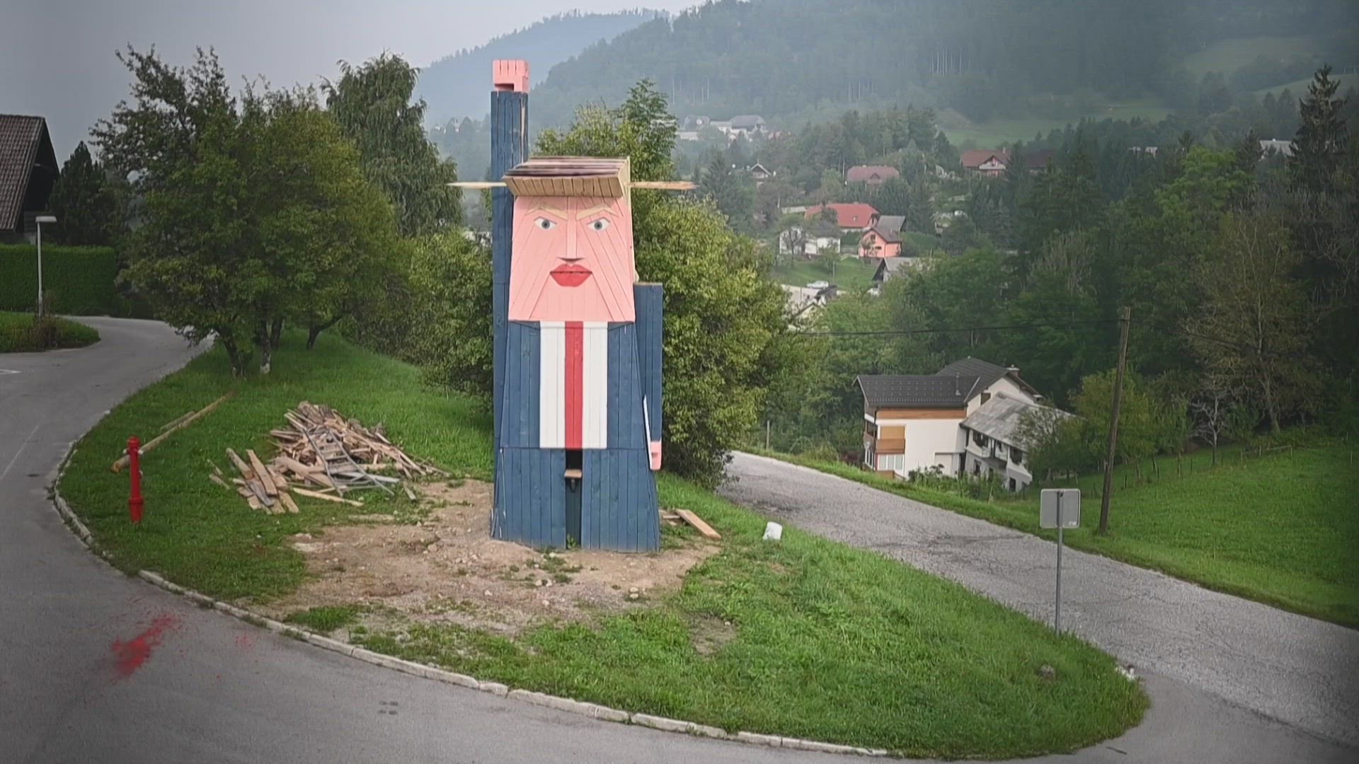 1970: the big building to near statue fling back side big christmas tree set for the red color light