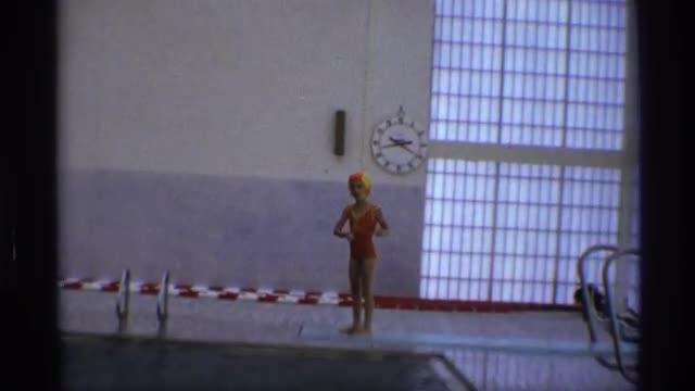 > 1971: a little girl jumps off a diving board in an indoor swimming pool NEW YORK