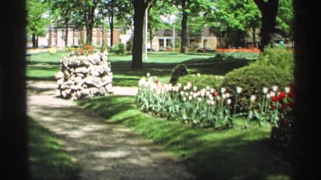 1969: beautiful pathway filled with colorful gorgeous flowers and interesting trees on a bright day.